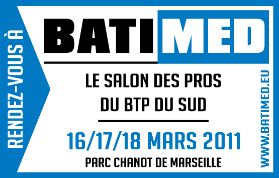 The third edition of the biennial event will be held at Park BATIMED Chanot Marseille, 2-22 March 2013. 350 exhibitors from all areas of the Building, Construction, Renewable Energy and the Environment exhibition area of ??20,000 sq.m. The multi-specialist exhibition dedicated to construction professionals construction professional bodies and institutions who the show